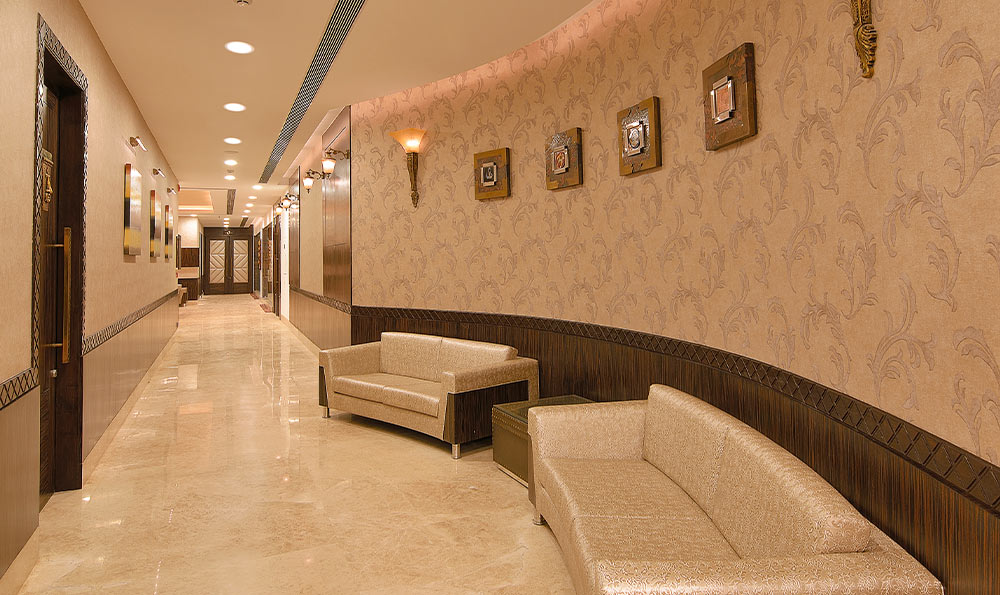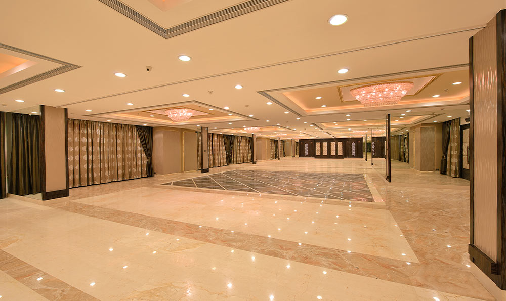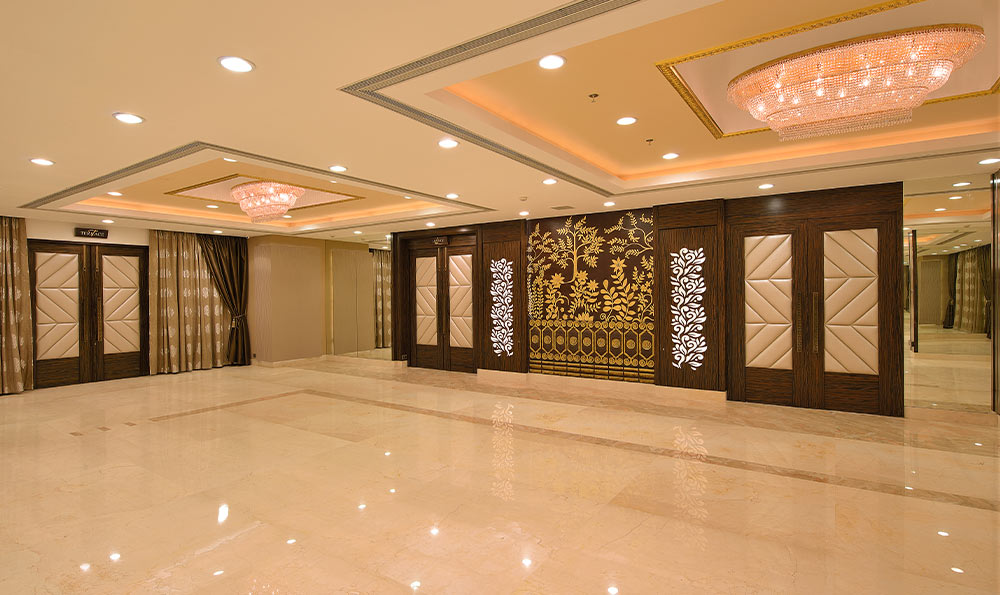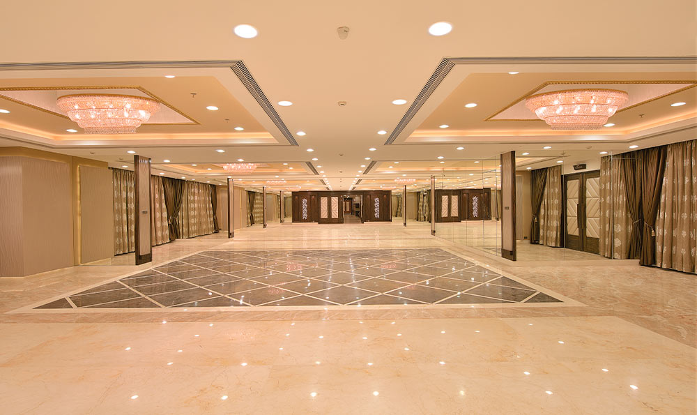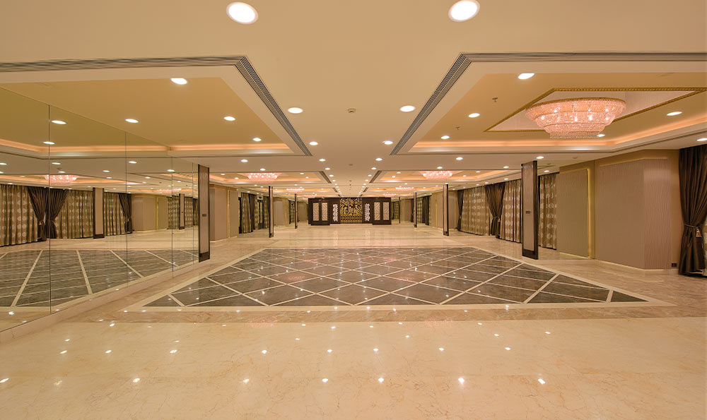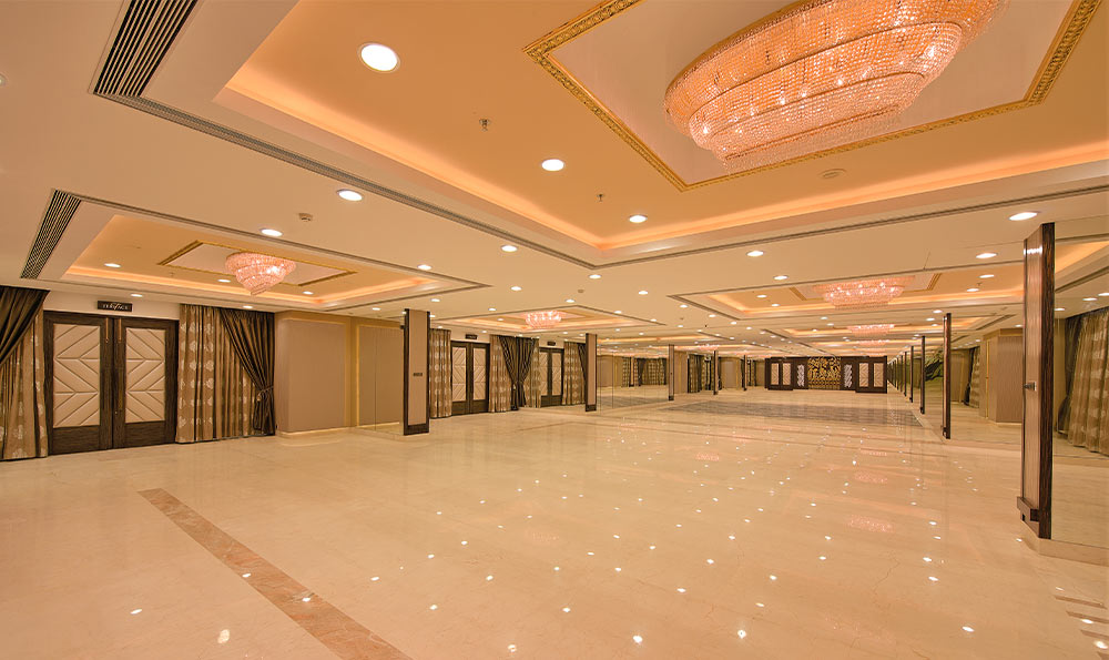 This space isn’t just beautiful; it’s also super flexible. The main hall is divided into three ballrooms using German-engineered sliding partitions, each with its sound system. This allows for everything from intimate gatherings to large events to happen seamlessly under one roof. Lighting was customised according to the space as well. We opted for chandeliers, LED strips, and CDMT mood lighting to match the varied space requirements.